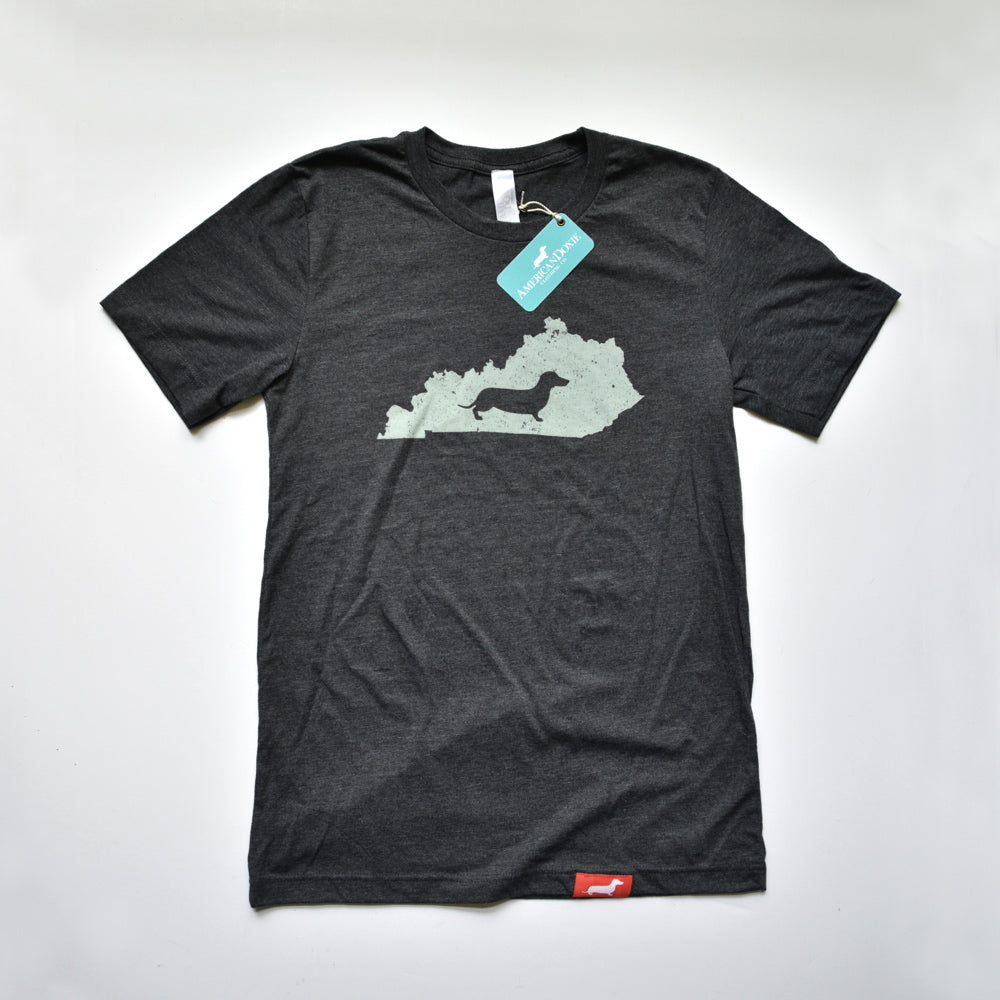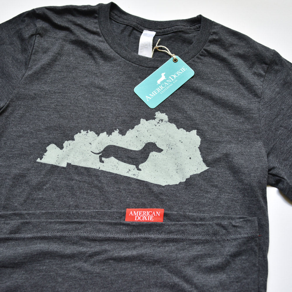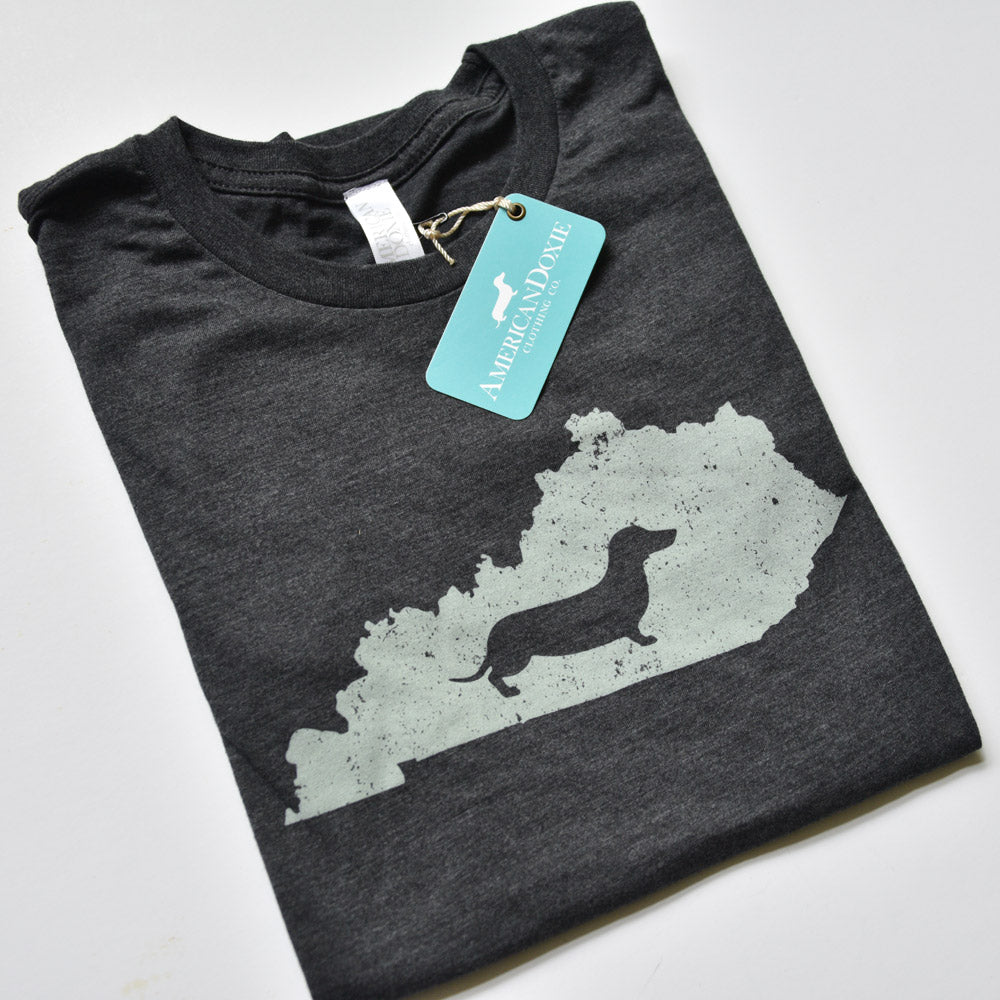 As part of our Doxie State Pride Series comes the Kentucky State Doxie Tee. Show off your KY + Dachshund Pride with this vintage style distressed print design, over a soft Dark Gray Heather tee. Check out more Doxie State Pride Tees here.
