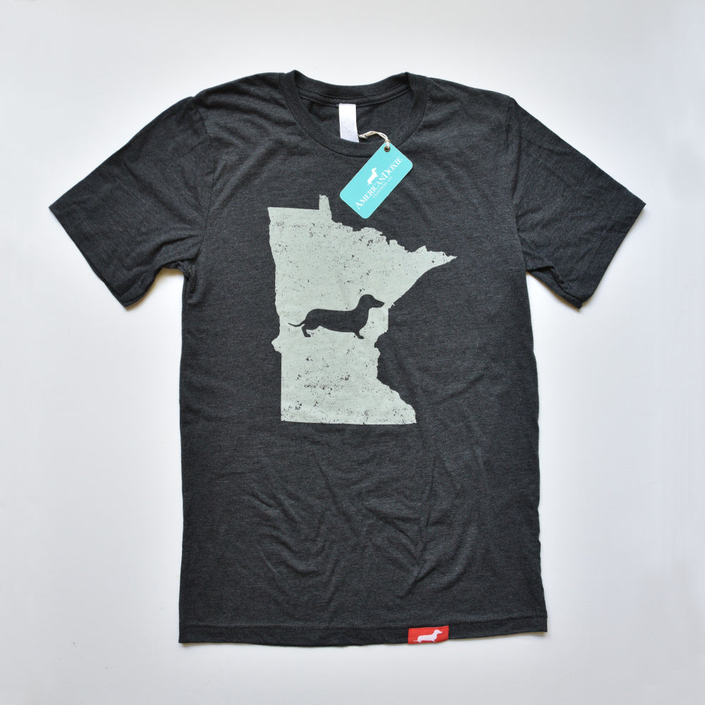 As part of our Doxie State Pride Series comes the Minnesota State Doxie Tee. Show off your MN + Dachshund Pride with this vintage style distressed print design, over a soft Dark Gray Heather tee. Check out more Doxie State Pride Tees here.