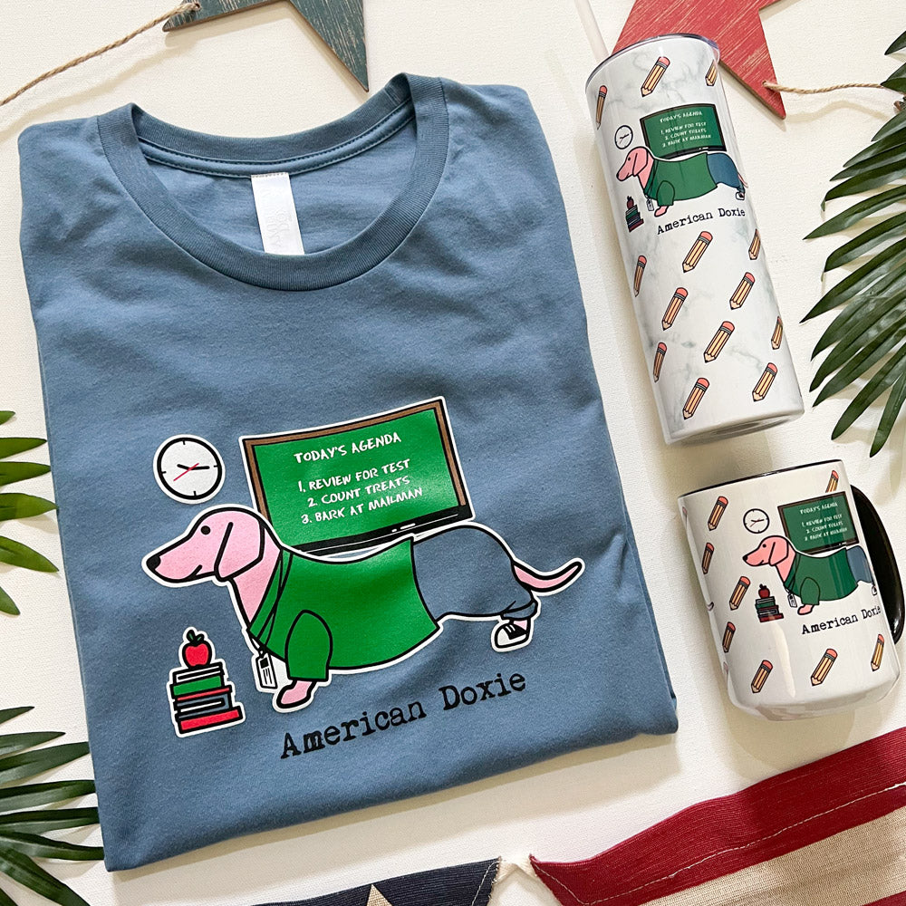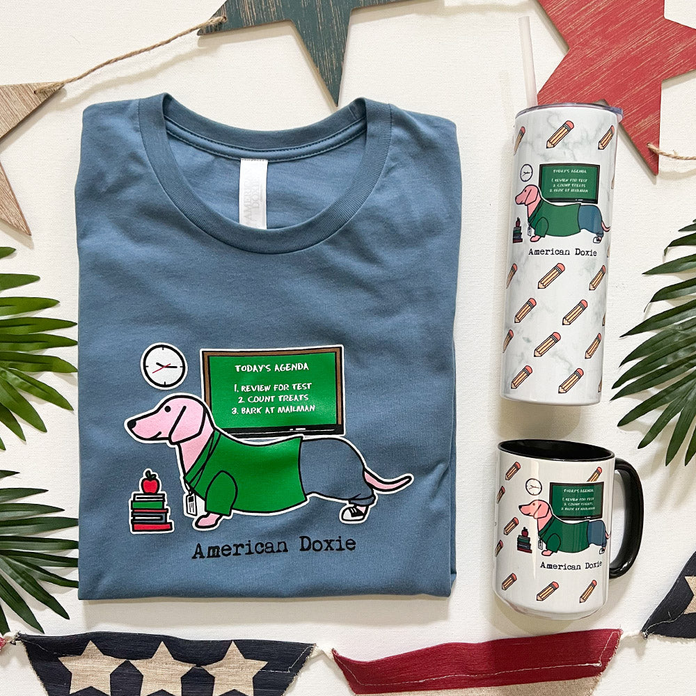 We're so excited to share the Teacher love with the newest addition to our Signature Series collection! Printed over a super soft steel blue short sleeve 100% cotton tee.